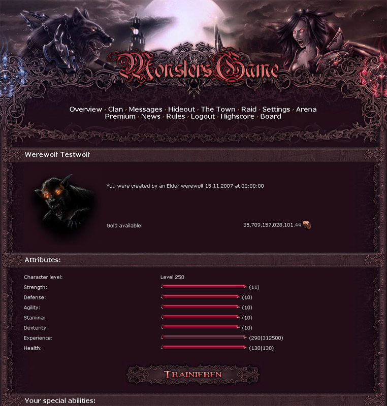 După înregistrare te vei afla pe pagina „Statut“ a personajului tău. Aici găseşti toate informaţiile importante legate de personajul tău, precum şi link-ul tău, cu ajutorul căruia poţi merge în căutare de victime pe tot cuprinsul internetului. De exemplu, poţi trimite acest link prietenilor tăi, poţi să îl introduci pe pagina ta personală sau îl poţi folosi ca semnătură pe forumurile de discuţii. Dacă o presupusă victimă accesează link-ul tău, aceasta va fi muşcată de către tine! La fiecare muşcătură ( ca vampir), îi sugi victimei tale 1-3 litri sânge, respectiv devorezi 1-3 kilograme carne (ca vârcolac). În plus, aceeaşi sumă va fi trecută în contul tău de aur. În cazul în care victima se înregistrează, atunci ai creat un nou vampir, respectiv vârcolac. Pe lângă aceasta, ţi se acordă 25% din pradă pentru fiecare victimă muşcată de personajele create! Îndată ce personajul creat de tine ajunge la nivelul 3, primeşti 50 aur şi un punct experienţă! Poţi folosi aurul pentru îmbunătăţirea însuşirilor personajului tău sau pentru a-ţi construi un adăpost sigur care să te protejeze de rasa inamică.