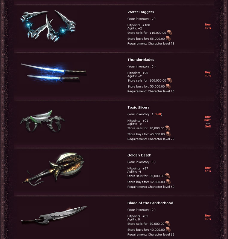 Link-ul "Premium" te conduce către zona de unde poţi cumpăra Cristale de Sânge. La Banca de Sânge poţi folosi Cristalele de Sânge pentru a cumpăra timp de Premium pentru contul tău sau le poţi schimba în aur la o rată dependentă de nivel. Cristalele de Sânge pot fi folosite de asemenea la negustor pentru a cumpăra amulete sau pot fi folosite pentru a-ţi îmbunătăţi arma pe pagina principală (sau de la pagina "Inventarului" dacă este folosită).. Inventar